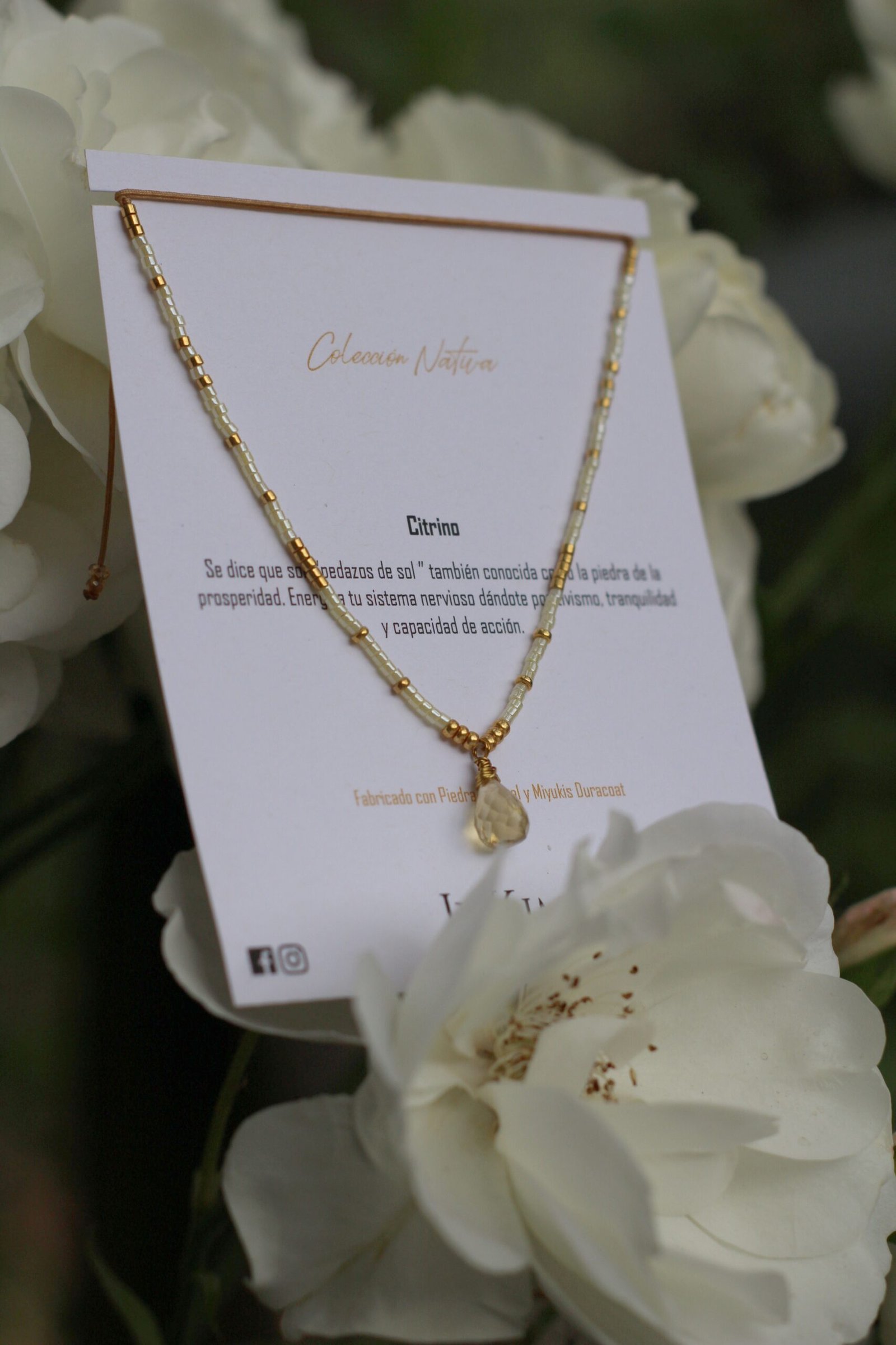 Es un collar tan liviano y cómodo que muchas veces te olvidas de que lo llevas puesto, siendo especialmente agradable en climas cálidos. Su uso es fácil y natural, generando un aspecto cuidado, delicado y energético en la vida diaria. Las mostacillas doradas realzan los colores del mineral, la luminosidad de la piel y el diseño en su conjunto.